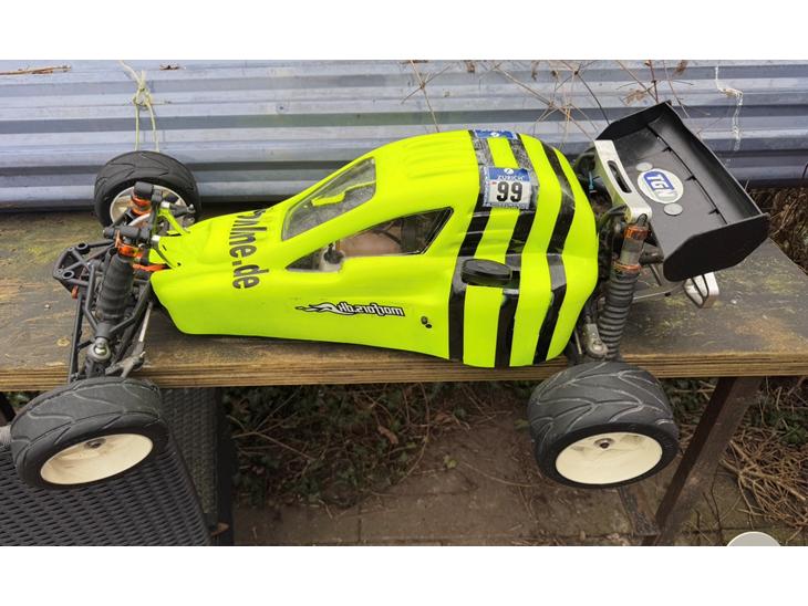 Det drejer sig om en Hpi Baja 5b, der lidt TGN alu lir på og en tun udstødning. Der er også monteret undertray beskyttelse på den, lige til og tage der værste. Vertigo forstærket kobling og gearing. Og anden karosse for og holde snavs ude. Og ja den har kørt, men der masser potientiale i den endnu.