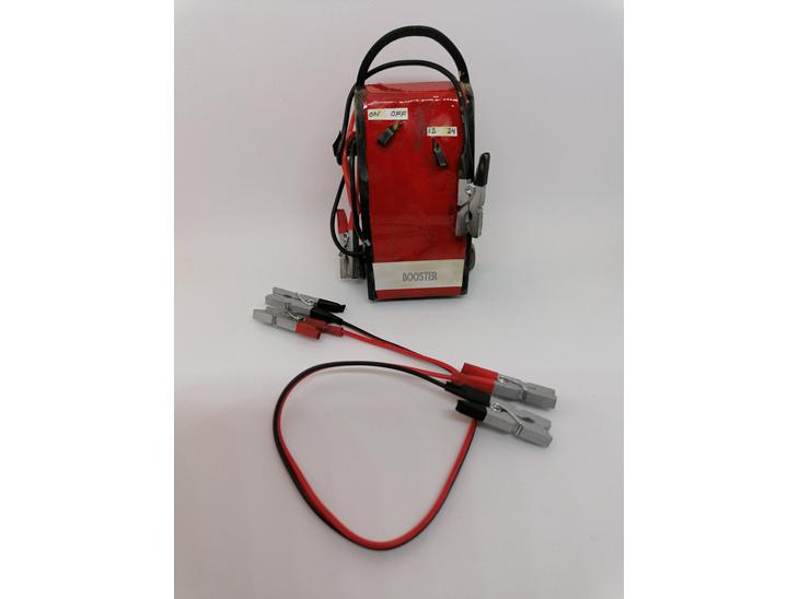 Min hjemmebygget 1/10 batteri booster til værkstedet og et sæt startkabler.