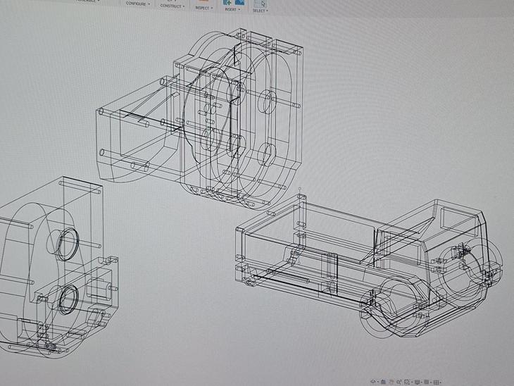 Gearkasse trukket af 4250 outrunner på 6s med primær gear modul 8 ren stål tandhjul, 2 sekundær udvekslinger begge med hpi baja 15/57 pinion spurhjul, bagaksel med pinion ringgear fra makita 1400 1600 watt vinkelsliber, alle aksler 8mm rustfri aksel stål, 8mm kardanner fra gearkasse til bagtøj, 3 punkts ophæng i bag og 2 punkts i for, bagdæk fra fg monstertruck 21 cm diameter, fordæk og fælge egwt design dæk printet i tpu, fører er en fra makerworld printet i 350% str, de sidste dele skulle være være ankommet så mere kommer når jeg får fri.