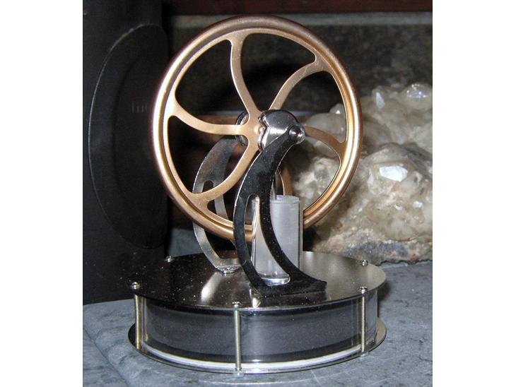 En "Stirling motor" er en motor som omdanner varme-energi (temperaturforskel) til bevægelse. Ved at der er en temperaturforskel på omkring 20 grader celsius (eller mere) imellem motorens overside og underside, vil hjulet begynde at køre rundt.