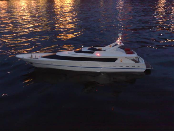 Drives pt. af 2 stk 7 cel SUB C 4000mah, der skal flere batterier i da skruer ikke rigtigt kommer ned i vandet. Radio 2 kanal 40 Mhz, 52 A regulator. Se også video hvor den sejler.