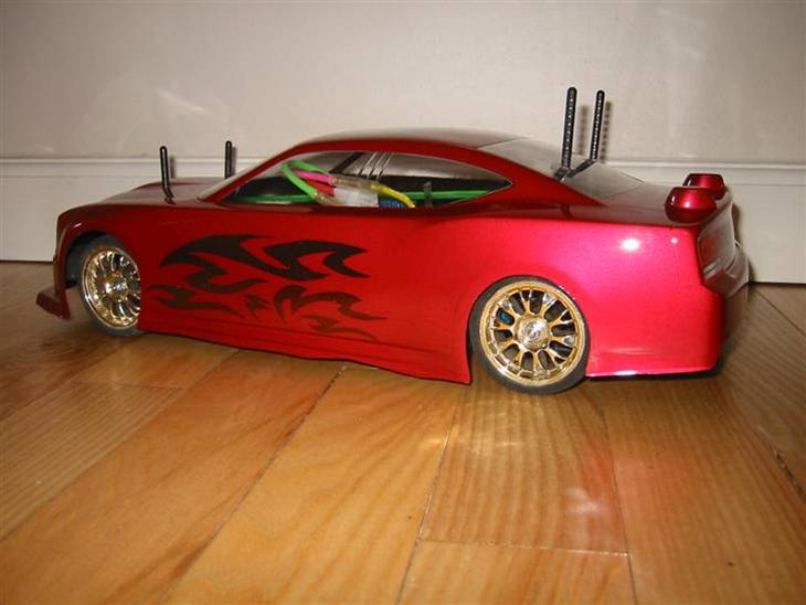 Hjemme malet karrosse Dodge Charger Mit første forsøg som gik lidt galt. Det er malet med Rød metal og grafikken er malet med Multicolour guld/rød fra Spaz Stix. Forsøget med malingen gik Rigtig godt men det gjorde de hulle der skal bruges til at holde karrosseriet på bilen de foreste er boret ca 1cm formeget til den ene side så jeg tror lidt at det hele bliver en ommer. Jeg har skiftet motoren men det fik jeg ikke rigtig noget ud af der er ca den samme top fart men tilgengæld kommer den der op meget hurtigere.