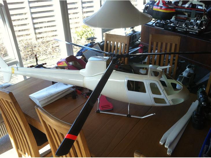 Scala 1:6,6 længde 1670 mm , højde 500 mm , bredde 320 mm, hovedrotor 3 bladet 1800 mm, halerotor 2 bladet 250 mm.