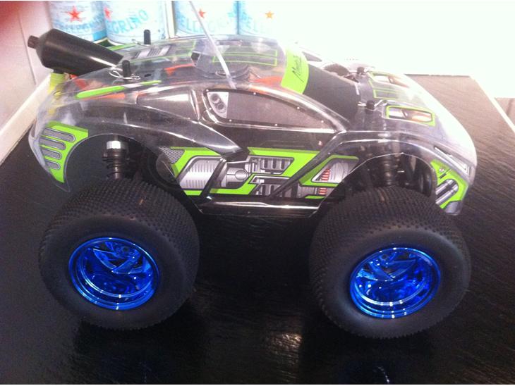 Så er der Tivoli vogn! Nye blå chrom ruller - masser af ballon! Blå chrom låsebolte - Chrom hane til at lukke for nitroen (noget nemmere end at holde for udstødningen eller hive slangen af til nitroen) - Blåt chrom brændstoffilter - Sort tunpotte - brændstoflines i orange - gul gummi på potten - Lyserødt træk til starteren - andet plastik cover - Failsafe