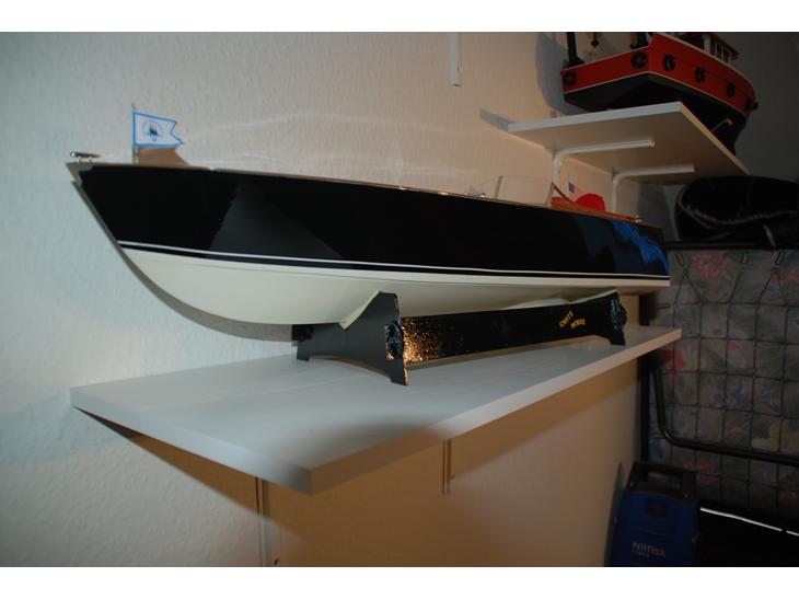 Byggesæt i mahogni fra tyske Aeronaut. Tidskrævende men yderst tilfredsstillende. Sejler meget fint og ligger pænt i vandet. Den er en kopi af en amerikansk spritsmuglerbåd fra starten af 1930erne. Disse havde motoren langt fremme og kun ganske lidt plads til fører + passager. Ofte var de udstyret med Ford eller Chevrolet V8 - og var sindssygt hurtige i datidens øjne. De vejede ofte 2,5 til næsten 4 tons så set i dag er det en sløv padde men smuk som bare fanden. I dag er de ofte betegnet som "gentlemans racers" og hammer dyre.