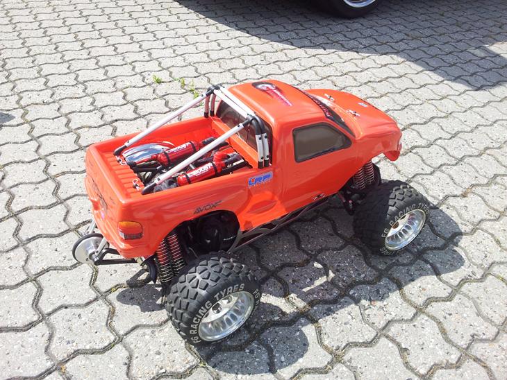 26 ccm zenoah med jetpro, boost kit fra bis racing, alu differentiale med fedt fra team fasteddy. Savox SV-0235MG styreservo (35kg v 7,4volt) Savox SC-1268SG (25kg v 7, 4volt) 2 styks 2600 mah 7,4volt modtager batterier og 1 styk 4600 mah 6 volt modtagerbatteri. killswitch fra iccom og et lrp 2,4 ghz 3 kanal anlæg til at styre det hele. kører på shell V-power 99 oktan med 3% castrol xr77 olie i :)