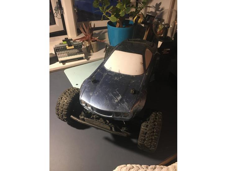 Den er købt brugt af en meget flink mand som lige havde samlet bilen for omkring 2 måneder siden, og så ville han hellere køre med monster truck, så han brugte den ikke, og så solgte han den til mig. Karossen på det sidste billede er på vej i posten så jeg har kun det billede