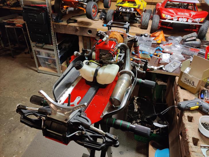 Adaptere til 24 mm hex vers. 1, vers. 2 er igang som en lidt smartere løsning hvor man ikke skal have en 2,5mm unbrakonøgle med sig for at skifte imellem de to typer hjul. Hjemmelavet alu støddæmper tårn i bag, hjemmelavet udstødningsbøjle i alu, forstærkning af karossen i næsen lavet af laserskåret rustfri plade. Alu forstærkninger af mudguards under karosse og alle bolte udskiftet til A2 RF.
