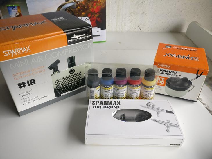 Minimal brugt sparmax mini kompressor, Sparmax rensebøtte og Sparmax double action sprøjtepistol samt kvalitets maling fra Vallejo, alle dele er ligesom nye også maling er næsten ikke brugt.