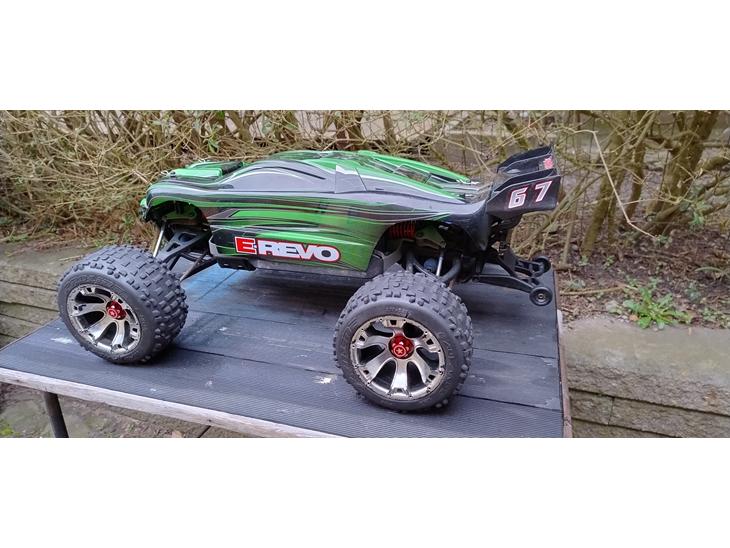 Fed, fin, stor og velkørende Traxxas E-Revo med det kraftige Castle Mamba Monster motorsæt, der tager op til 6S lipo. Fornuftig og original stand, Proline Badlands dæk. Prisen i annoncen er for bilen som den ses på billederne incl. sender, men uden batterier og lader. Traxxas-stik til ESC kan evt. medfølge.